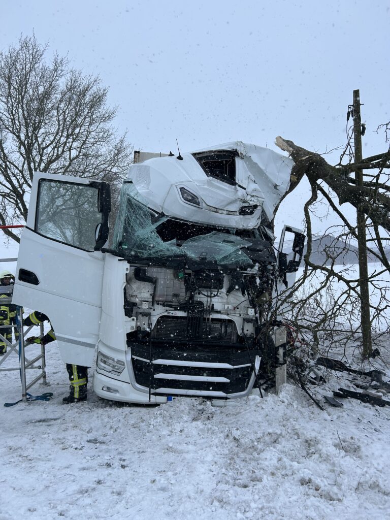 Ein Lkw-Fahrer verlor, bei seinem Überholvorgang, die Kontrolle über das Fahrzeug, kam nach links in den Straßenraum und prallte frontal gegen einen Baum. Der Aufprall war so stark, dass das Führerhaus völlig zerstört wurde, der Straßenbaum in der Mitte abbrach und die Telefonleitung zerriss.
