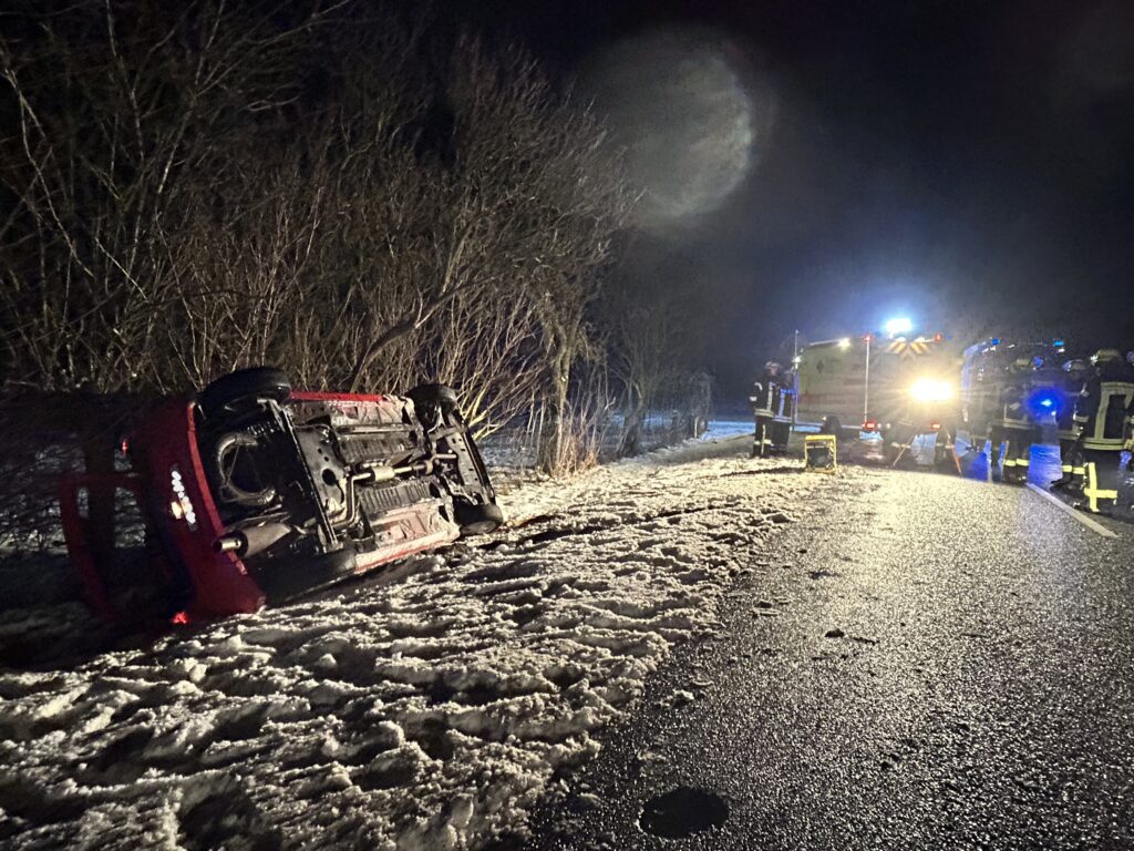 Eine 35jährige Dacia-Fahrerin verlor durch eine Schneewehe die Kontrolle über ihren Kleinwagen und kam ins Schleudern. Der Wagen schleuderte daraufhin in einen Graben und blieb auf der Fahrerseite liegen.